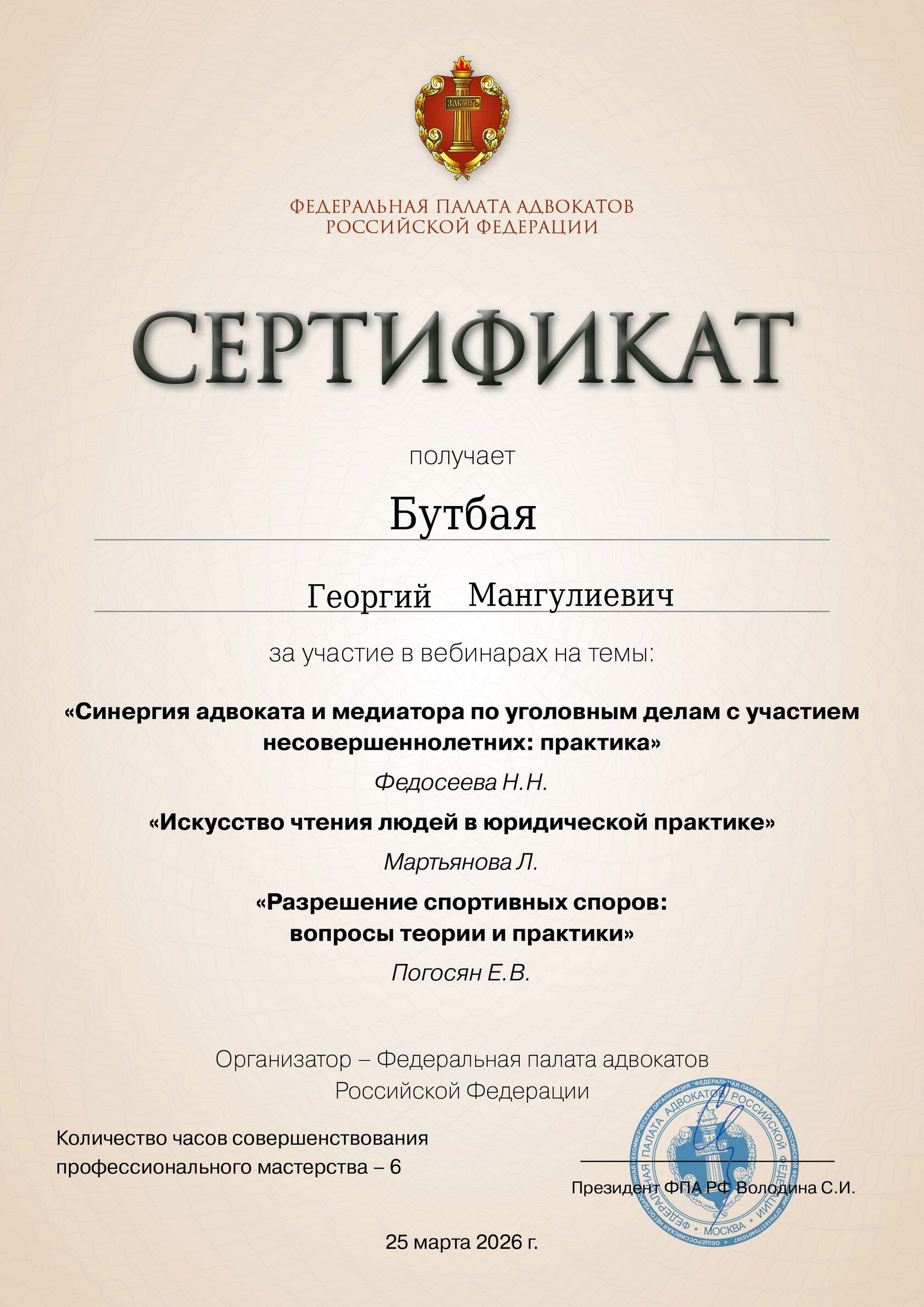 Сертификат о повышении квалификации участника онлайн-семинара на темы: «Особенности рассмотрения в суде дел, вытекающих из наследственных правоотношений», «Медиация в семейных спорах», «Особенности жилищно-правовых споров, осложненных интересом несовершенолетних»