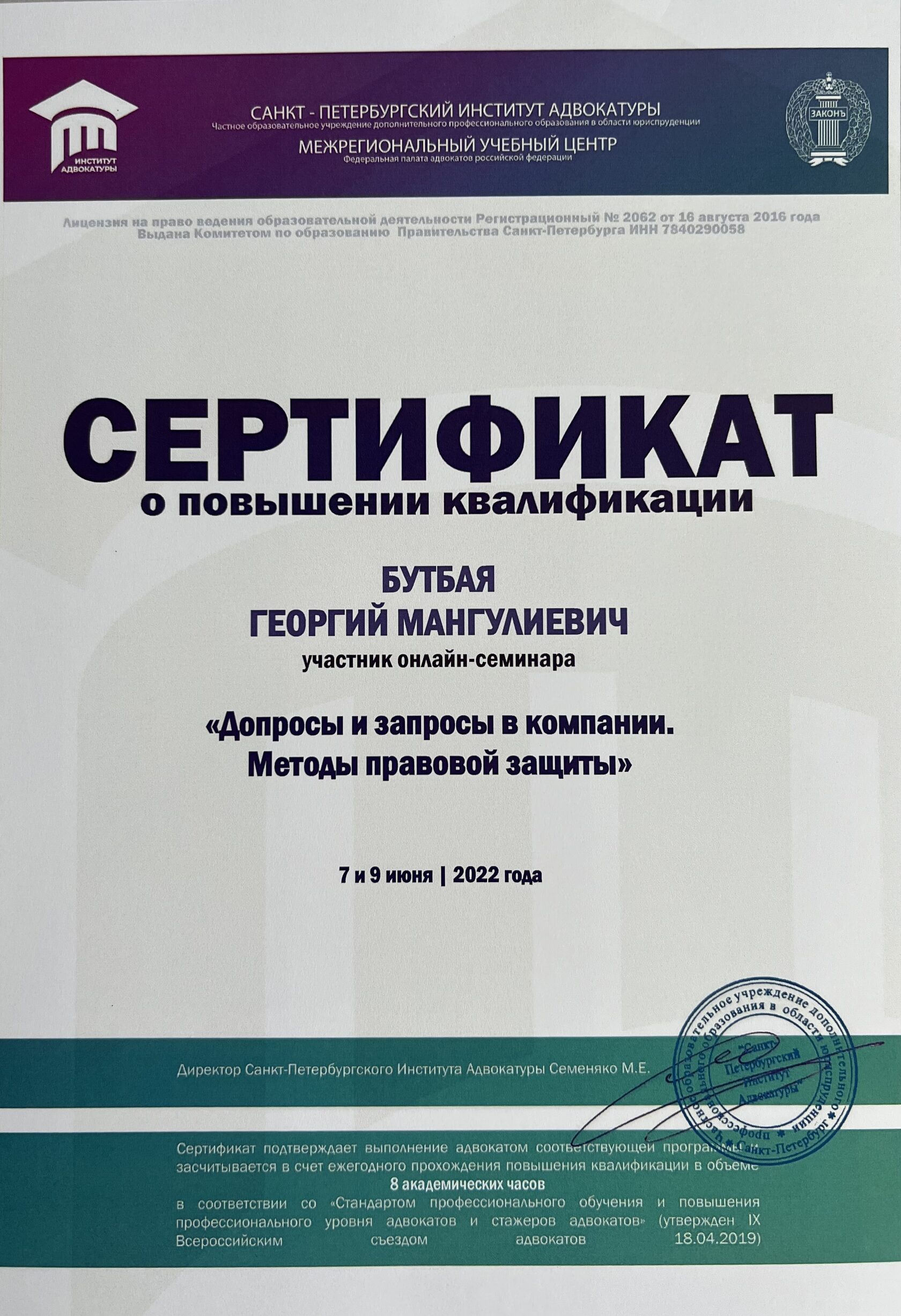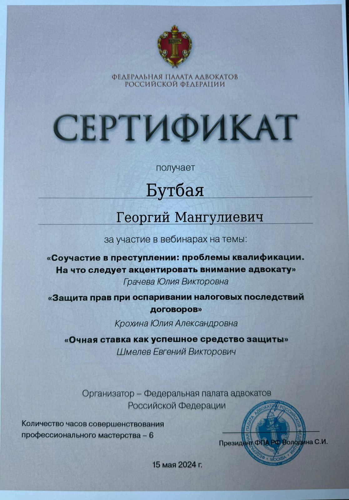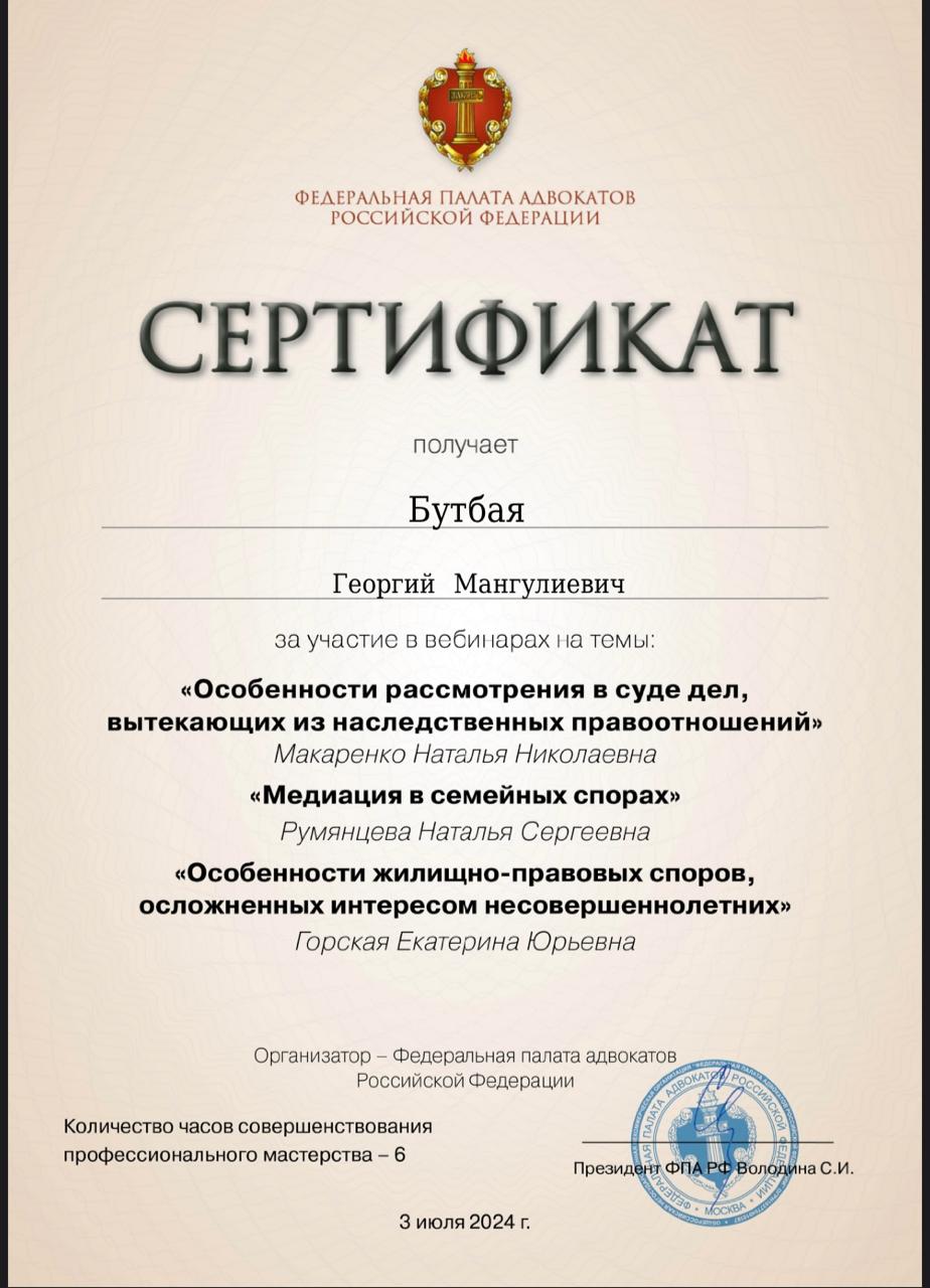 Сертификат о повышении квалификации участника онлайн-семинара на темы: «Особенности рассмотрения в суде дел, вытекающих из наследственных правоотношений», «Медиация в семейных спорах», «Особенности жилищно-правовых споров, осложненных интересом несовершенолетних»