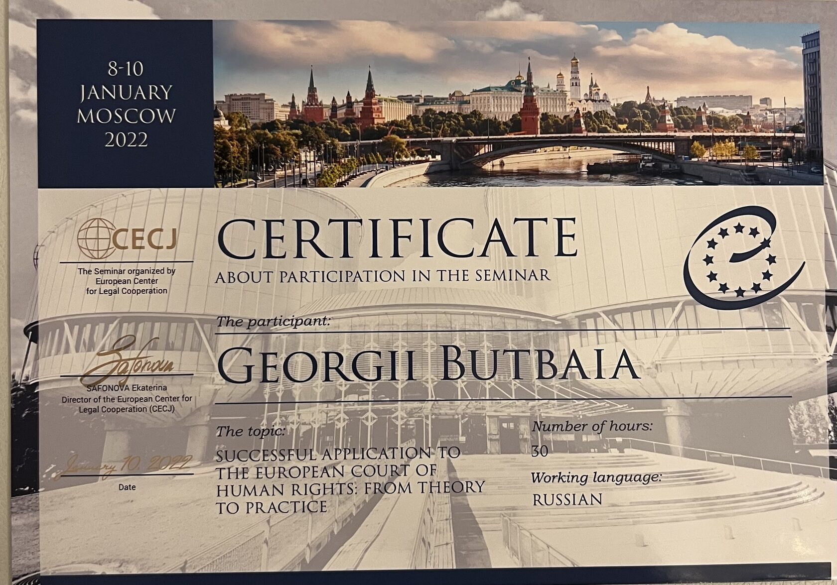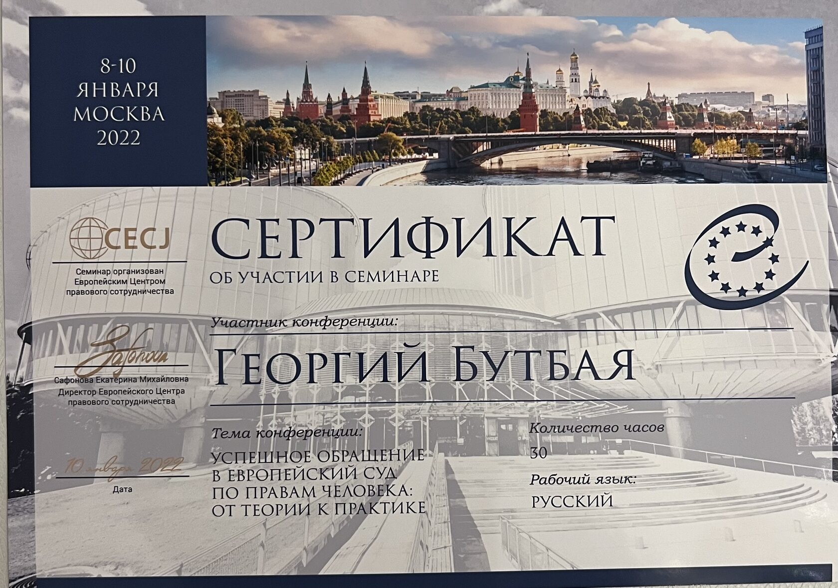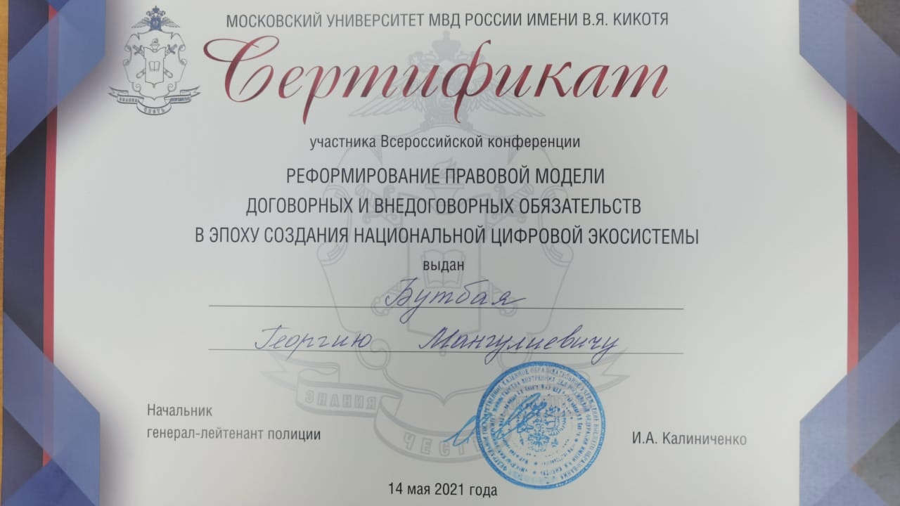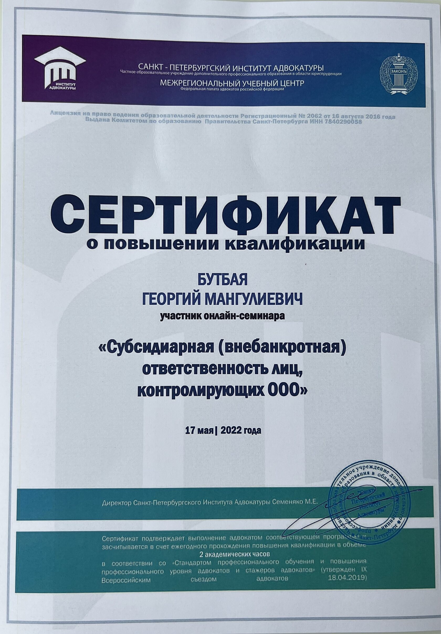 Сертификат о повышении квалификации участника онлайн-семинара на темы: «Особенности рассмотрения в суде дел, вытекающих из наследственных правоотношений», «Медиация в семейных спорах», «Особенности жилищно-правовых споров, осложненных интересом несовершенолетних»